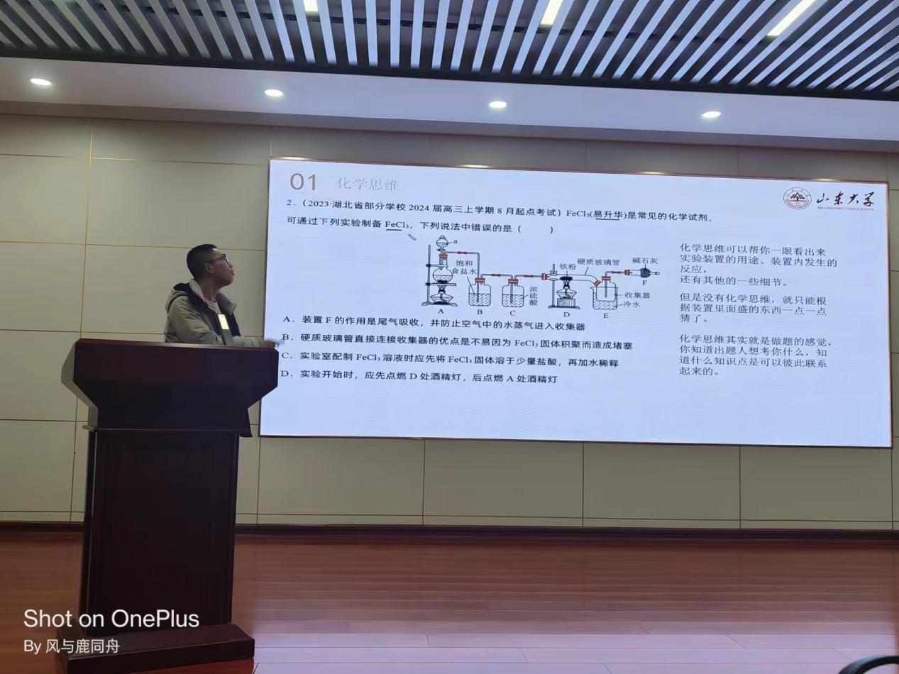 陈虹宇着重讲解了化学思维和做笔记习惯两个方面。在讲解化学思维的时候,老师以一道模拟实验题为例,详细讲解了通过联想和想象解决问题的化学思维。每一个装置、每一个方程式,并非孤立,而是环环相扣如锁链一般,表面上只有两种物质反应,但只有深究反应条件和反应物的变化,才会得到真正的答案。