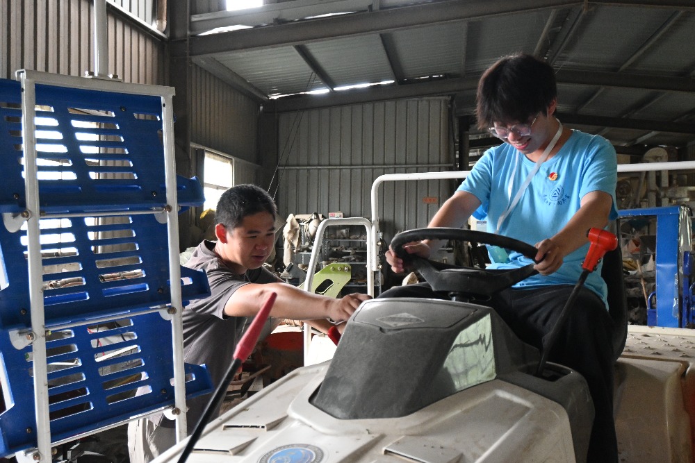 图为农创客邱杰波向支队成员介绍农机的基本操作
