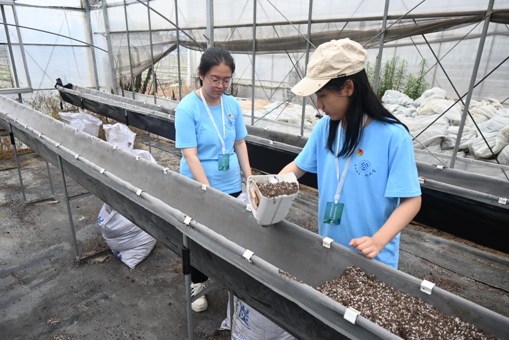 图为实践团成员观察玉兰果蔬农场的幼苗栽培