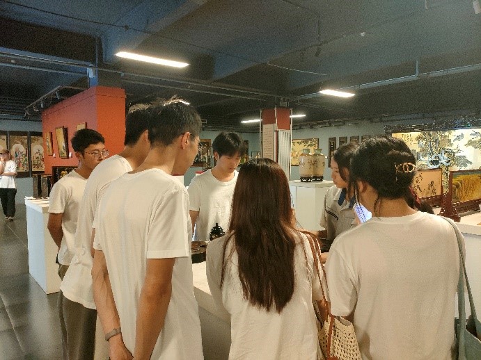 随后,实践队员们还参观了来自全国各地国家级、省级工艺美术大师的精品展览。在这里,他们看到了描金彩绘、三金三彩、堆鼓罩漆等多种技艺的完美结合,感受到了平遥推光漆器古朴典雅、富丽绚美的艺术特色。其中,由国家级非遗传承人薛生金先生创作的《百猫戏春图》更是成为了展览的亮点之一,其细腻的笔触和生动的形象赢得了队员们的一致好评。