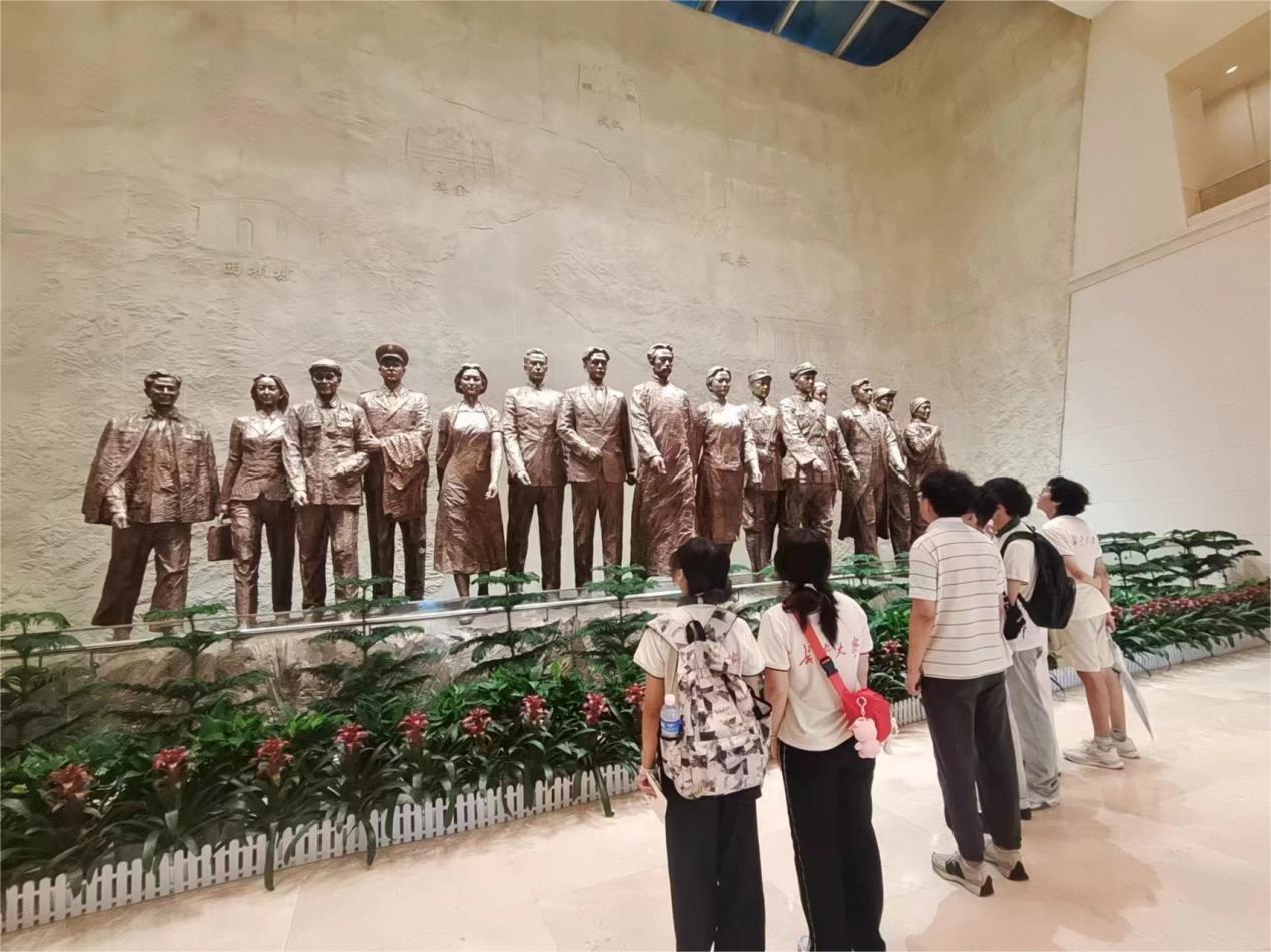 之后,实践队来到了中国共产党纪律建设历史陈列展览馆。步入其中,首先映入眼帘的是一座雄伟的雕塑。雕塑中,十五位革命先驱们姿态各异,有的手持公文包,有的怀抱粮袋,有的挥舞着革命的旗帜。他们的眼神坚定,目光如炬,仿佛能穿透历史的尘埃,直视那即将到来的黎明。顺着他们的目光望去,仿若能看到一片广阔的田野,那是革命胜利后的丰收与希望。这些先驱们用他们的汗水和智慧,在武汉这片土地上绘制出了革命的蓝图,用他们的坚韧和勇气,铺就了通往自由与平等的康庄大道。他们的伟大,不仅在于他们所成就的事业,更在于他们用平凡的身躯,书写了不凡的历史篇章。