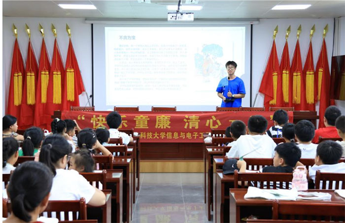 在新港村,队员们结合自身成长经历为孩子们和家长开展清廉故事宣讲会,播放了“家风家训”系列动画,通过故事欣赏和互动问答,孩子们和家长了解到树立孝善廉洁家风的重要性。在廉洁知识抢答赛上,大家聚精会神听题,抢抓机会答题,呈现出一场紧张热烈、扣人心弦的清廉知识大对决。通过活动,孩子们收获了大批来自实践团队成员们设计的清风扇、清风袋、清廉小册、小公仔等清廉主题文创产品。