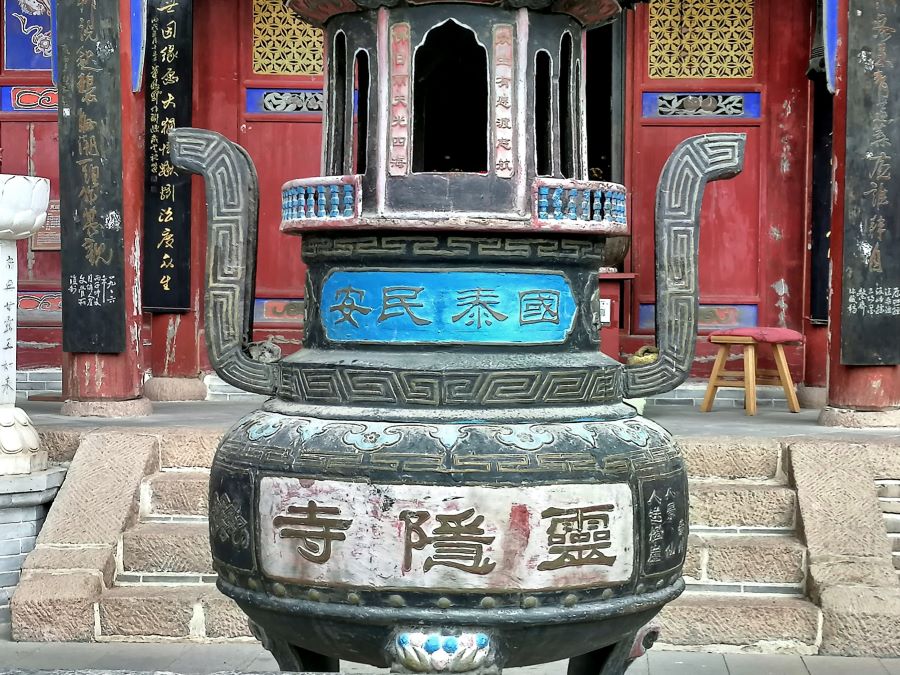 灵应寺作为整个西崖的核心,在殿前矗立着一座三米高的宝塔,极其庄严、肃穆。实践团成员观察到宝塔的塔身上刻着“国泰民安”四个大字。“灵应”意为愿望成真,僧人将“国泰民安”的宝塔放于“灵应”之下,表达了寺院对于中华民族的美好祝愿。