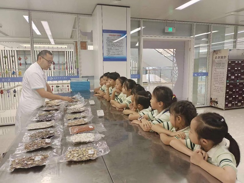第一站,学生们在实践团成员的带领下来到了中药房,识别了十余种常用中草药、观看了中医药文化展示柜当中多姿多彩的中药标本,学生们也惊奇地发现自己日常生活中经常见到的龙眼、菊花、大枣、枸杞等竟然变成了药品,药师为大家讲解了“药食同源”的理念。最后中药房还为大家准备了酸梅汤和忘忧茶以及艾草香囊,酸梅汤的淡淡甜味在舌尖蔓延开来,让人回味无穷、祛暑散热,忘忧茶则养肝疏肝、解放身心,而艾草香囊更是有着驱赶蚊虫,精神醒脑的功效。