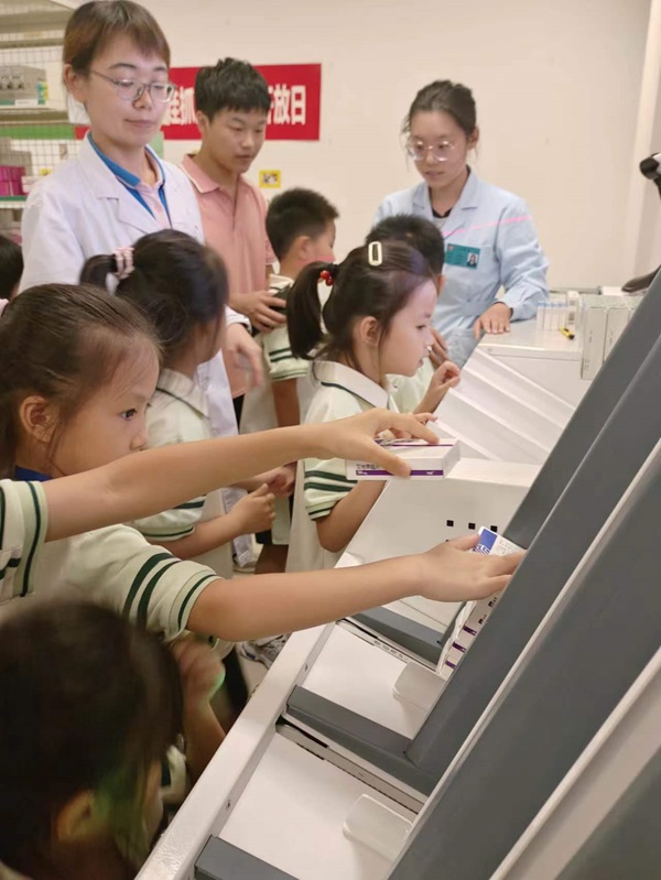 最后,在西药房孩子们参观了自动发药机,工作人员讲解了全自动发药机的工作流程,实践团成员带领学生们体验了全自动发药机的发药过程,让其真切体会到了智慧药房的先进和便利。