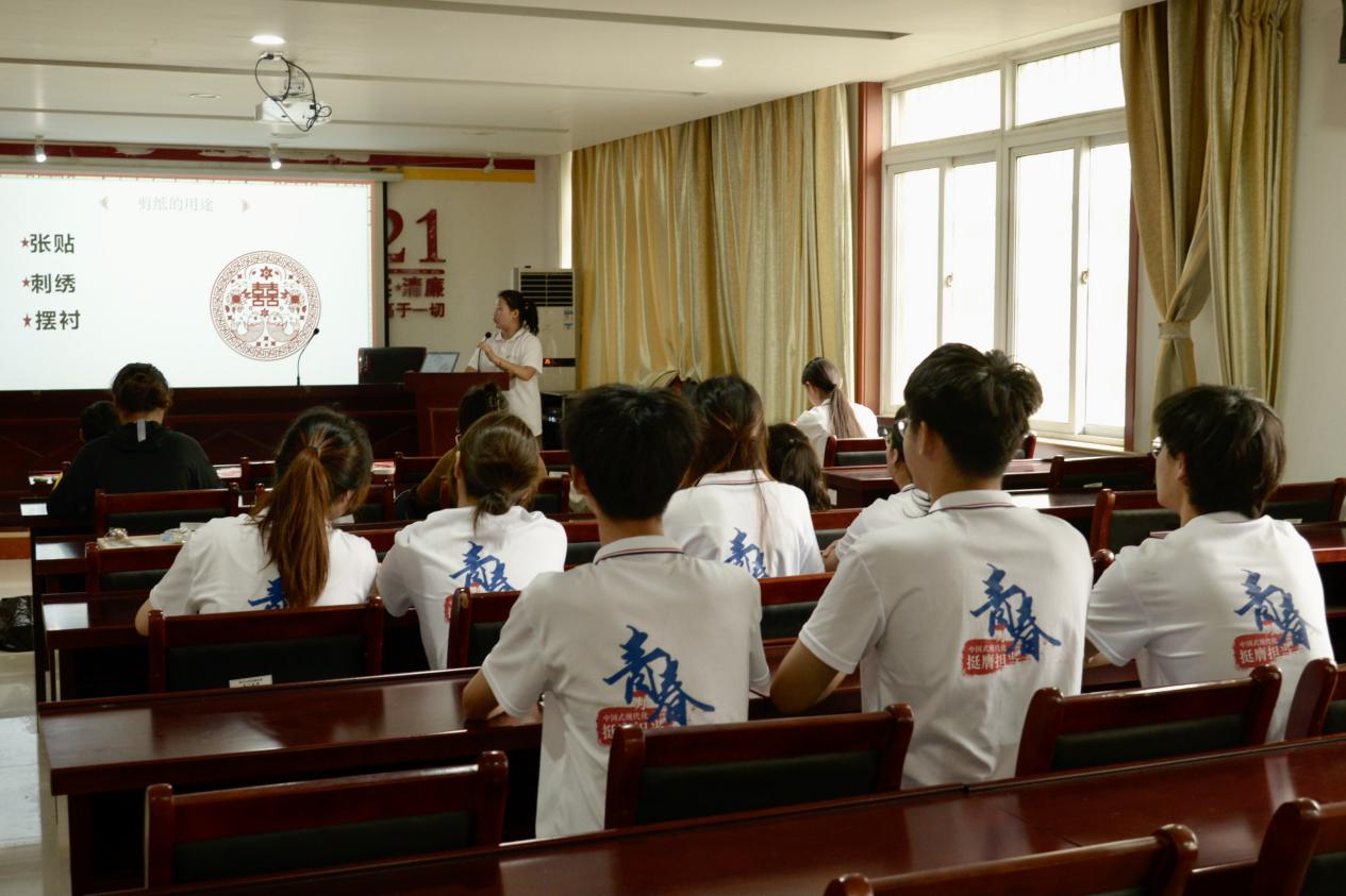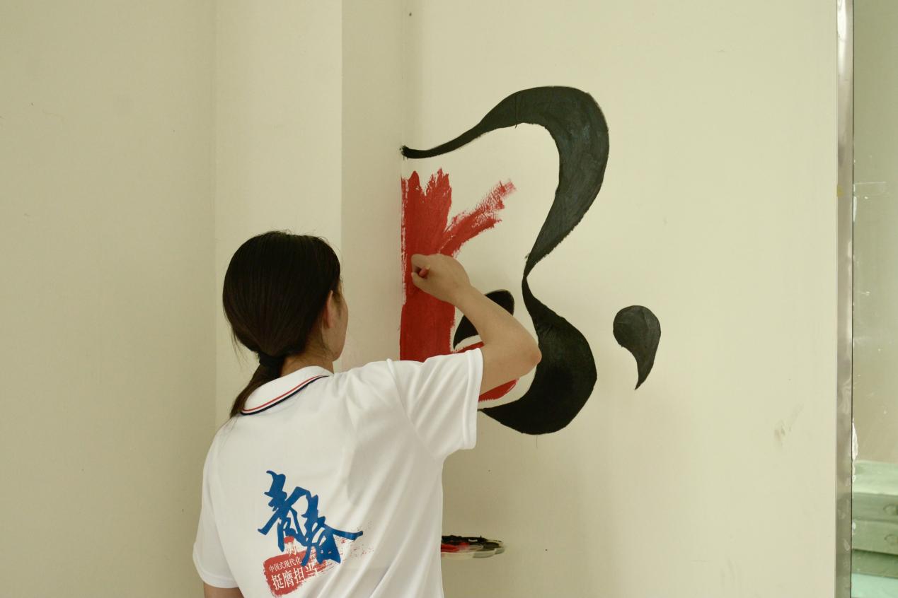 在学校老师的带领下,团队成员行走在寂静的校园中。志愿者们分工合作,最大限度地发挥自己的专业优势。白墙上的一笔一画,卵石上的天马行空,指尖中的一剪一划,都诠释着志愿者对传统文化的理解和对非遗的热爱。