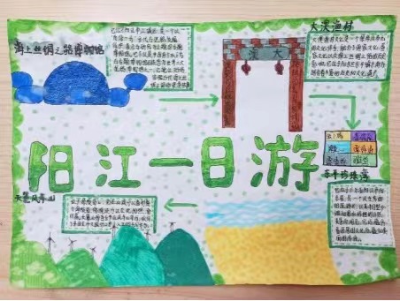 7月15日至7月26日,华南师范大学书画协会流墨实践服务队与阳江市阳东区南华实验学校共同举办“盛夏启航,流墨向阳”线下夏令营暑期社会实践活动。在乡村振兴战略日益深入的推动下,文旅融合的作用愈发凸显。为响应《“十四五”旅游业发展规划》指出的坚持“以文塑旅,以旅彰文”的基本原则,进一步发挥阳江的文化优势和旅游资源优势,流墨队调研组以南华实验学校此处夏令营的学生为对象,组织开展文旅设计特色活动。活动主策划人员由调研组的黄辉、高佳瑜、黎育君和刘京霖担任。本次特色活动分为两个部分,分别是文旅设计活动介绍和学生设计作品评比。