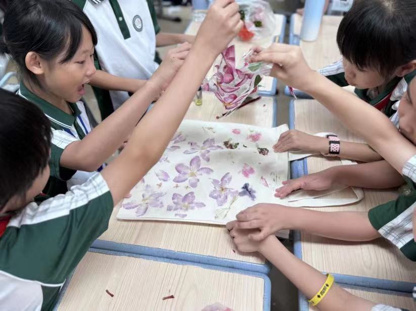 在创作过程中,部分小组也遇到了一些挑战。比如,有的植物叶片太脆,轻轻一敲就碎裂开来,需要重新挑选和尝试;不同种类的植物在敲打后留下的色彩深浅不一,需要调整力度才能达到理想的效果等。小组导师发现后及时与学生们进行沟通,并与学生们共同找到了解决方法。这些小插曲不仅考验了师生们的应变能力,同时也增加了活动的乐趣,也让学生们更加珍惜手中的来之不易的劳动成果,重视每个小组的实践作品。