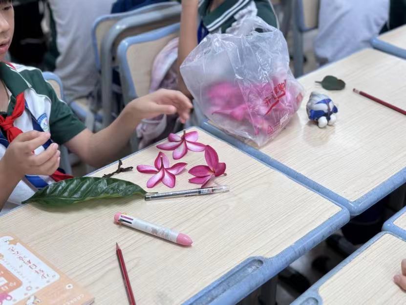 活动前期,宣传组组员根据活动方案有条不紊地开展准备工作,并向学生们发出了一项特别任务,即利用课余时间,在校园内外收集形态各异、色彩丰富的植物。学生们兴致高昂,与家长共同搜集了许多美丽的花叶准备着活动的到来。在活动当天,导师们把教室布置成了一个临时的工作坊,将桌椅整齐排列成几个长方形,桌上摆放着学生们挑选的各种植物。宣传组组长陈一宁向学生们介绍此次活动的流程,并向每组分发准备好的拓印工具包,其中包括小锤子、一碗盐水、剪刀和胶带等。