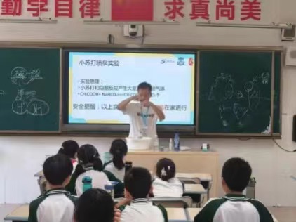 在“小苏打大魔力”课程中,黄坤与同学们揭秘小苏打的神秘身世,从它的起源、悠久历史一直到如今在各个领域的惊人应用,比如烘焙、清洁、甚至医疗,接着黄坤以更加贴合学生学情的方式,带同学们了解小苏打的“魔法成分”,以及在化学反应中扮演的角色。然后黄坤向同学们科普酸碱性,使用pH试纸测定小苏打和醋酸,同时给同学们发放pH试纸。课堂后期,黄坤与同学们跳出课本,去发现小苏打在厨房、家务中的神奇功效。最后黄坤向同学们进行实验展示,使用小苏打、醋酸、洗洁精、塑料瓶制作“小苏打喷泉”,实验效果显著,收获较好的课堂效果,深受学生欢迎。