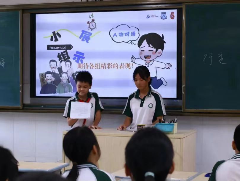 在红色历史名人介绍第二节课堂,康明月提前准备好历史人物对话的配音材料,比如陈独秀和易白沙讨论国家出路的谈话。经过小组讨论与准备后,邀请各小组上台展示。