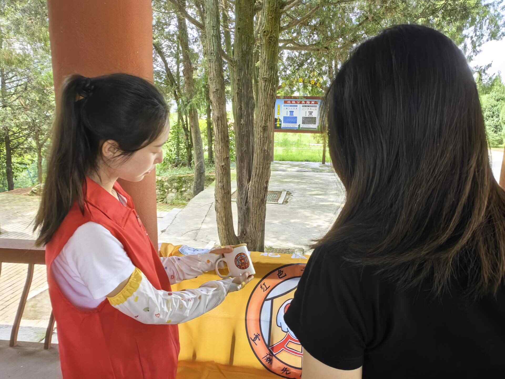 图为实践队队员为当地群众售卖文创产品时的场景。