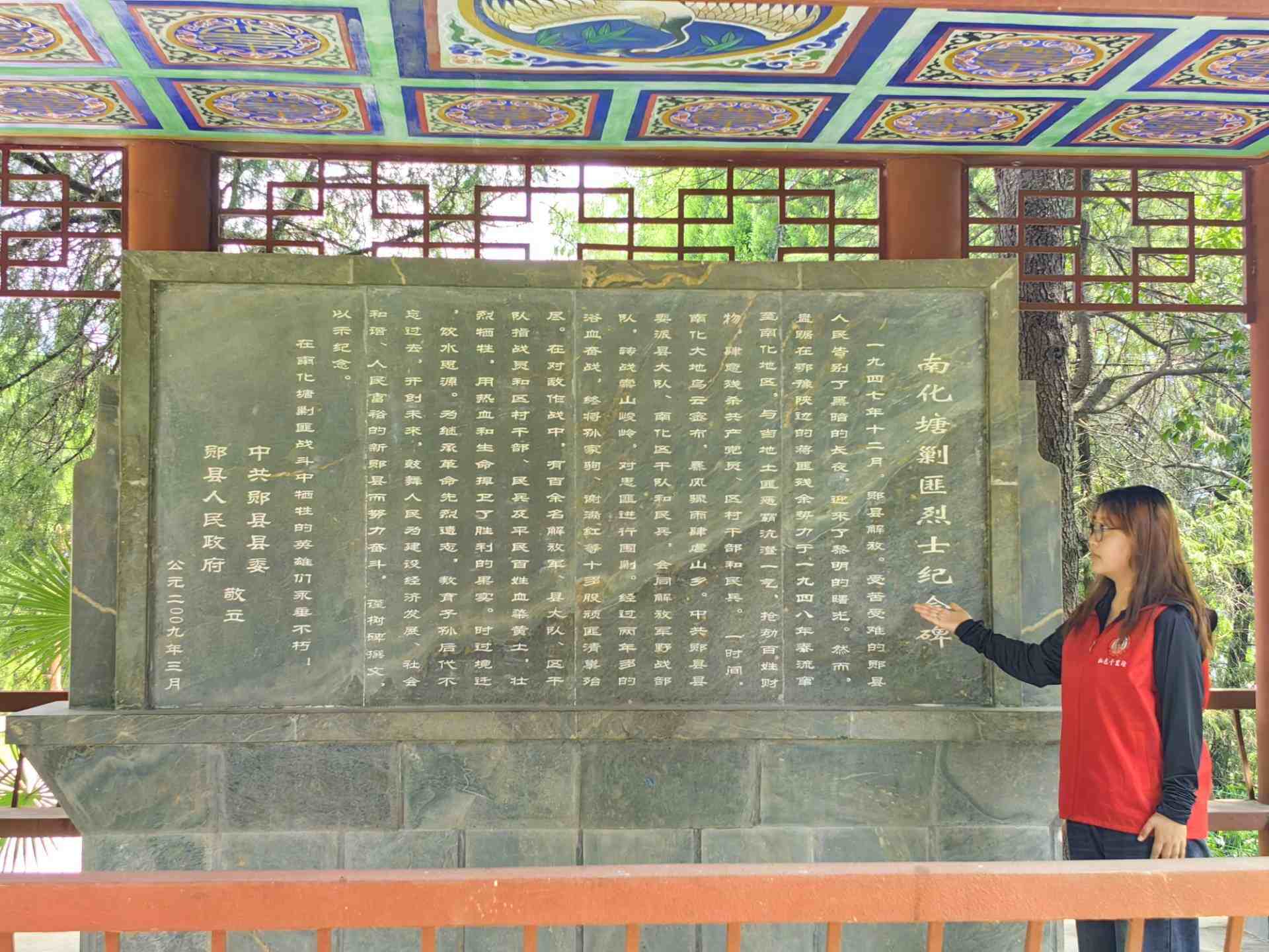 图为实践队队员讲解在革命烈士陵园讲解剿匪故事的场景。
