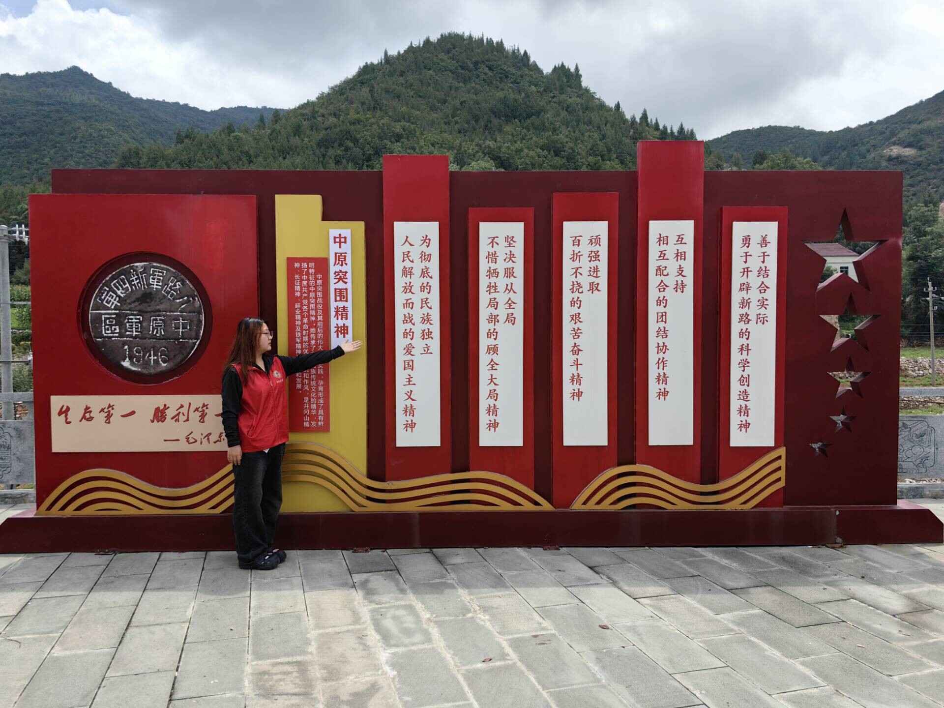 图为实践队队员讲解玉皇山中原突围精神的场景。