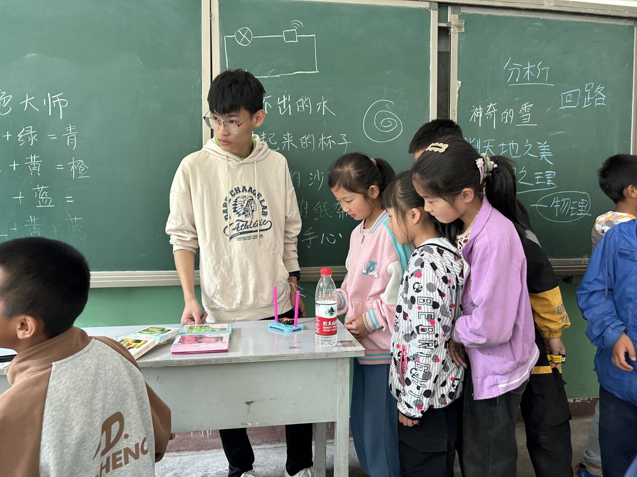 到下午后教学工作正式开始,我们的实践活动从科学实验开始。在一间简陋的教室里,我们用简单的实验器材为孩子们展示了科学的神奇魅力。比如,用醋和小苏打制造出的化学反应,让孩子们惊讶得张大了嘴巴;用气球和塑料瓶演示的空气压力实验,引发了孩子们的热烈讨论。看着他们专注的神情,我们仿佛看到了未来的科学家正在萌芽。我们耐心地为他们讲解实验原理,鼓励他们自己动手尝试。孩子们的积极性被充分调动起来,他们在实验中感受到了科学的乐趣,也激发了他们对知识的渴望。