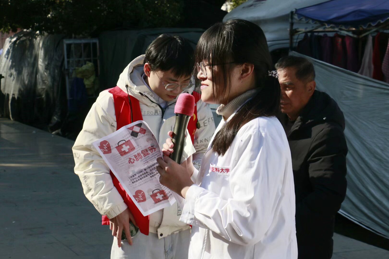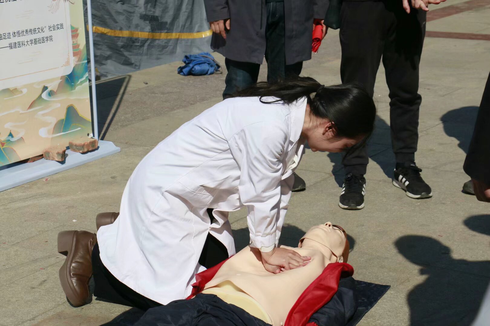 活动中,实践队队员柯宇彤以贴近村民生活的视角,针对日常生活中频发的肚子痛问题,进行了生动详尽的科普讲解,深入浅出地引导村民们认识腹痛的多样成因及科学应对之策。紧接着,实践队成员与指导老师携手,给当地村民和福建水利电力职业技术学院的老师们现场演示了心肺复苏术,细致入微地讲解了实施心肺复苏的关键注意事项及标准操作流程,强调了急救技能在关键时刻的重要性。此外,实践队还精心安排了急救包扎知识的讲解,让村民掌握简单的应急处理措施。