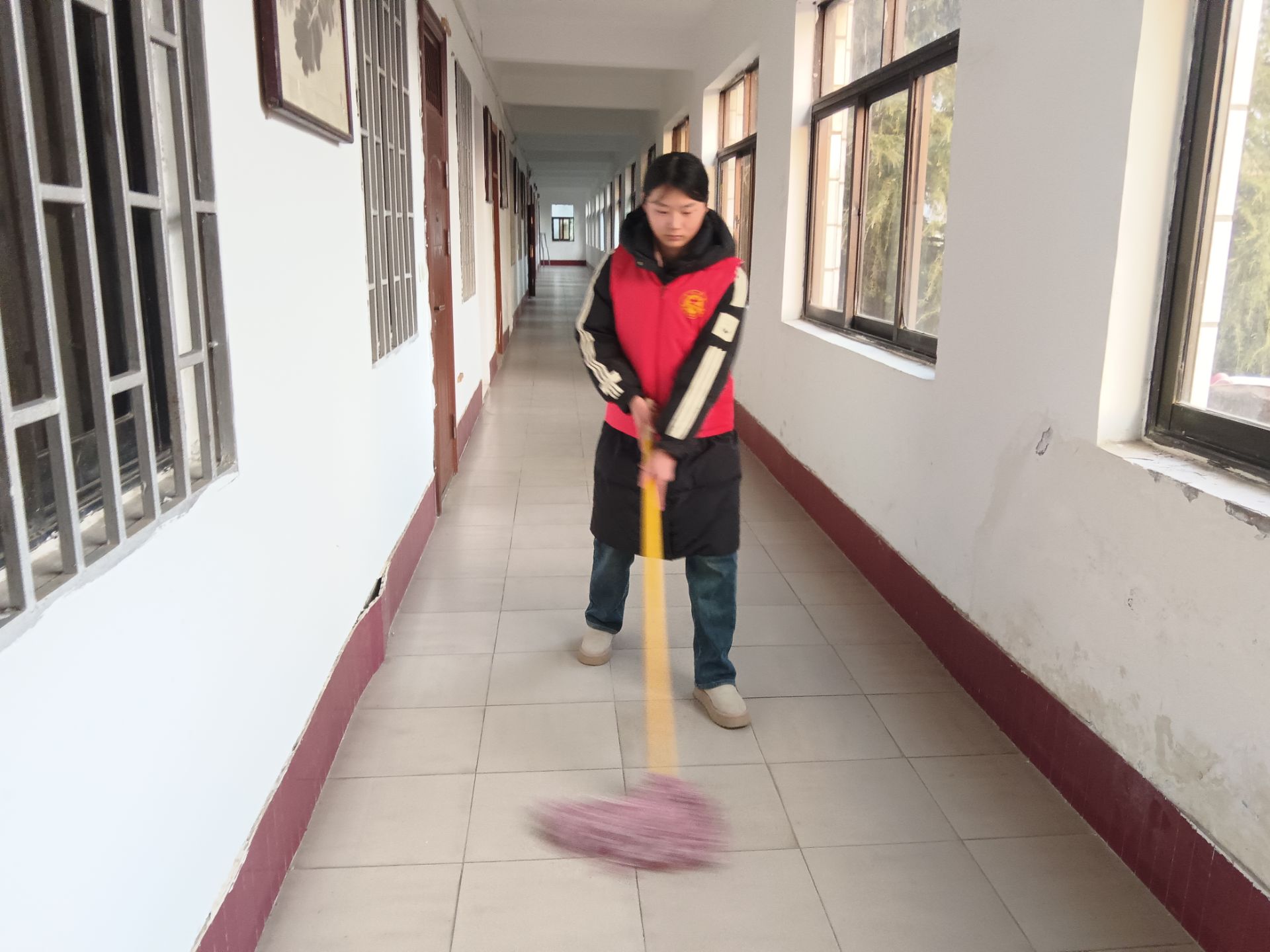 图为实践团成员拖走廊地面