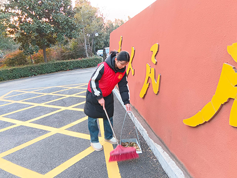 图为实践团在公共区域打扫落叶