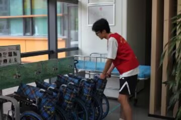 此外,实践团针对医院便民设施开展细节优化工作。在共享轮椅停放区,成员们按规范流程检查设备状态:逐一调试刹车灵敏度、擦拭扶手污渍、规整停放位置,并补充更新褪色的使用指引标识。通过细化“设备维护—环境整理—用户引导”的衔接环节,提升共享轮椅取用便捷性,累计完成12台设备的维护及6处标识更新,完善便民服务,改善了人们使用设施的感受。