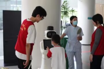 随后,实践团转至医院大厅,围绕智能导诊机器人开展辅助服务。在儿童就医过程中,成员们配合医护人员引导患儿与机器人互动——通过协助触摸查询界面、解读健康动画内容等方式,缓解患儿对医院环境的紧张感。过程中,团队重点观察机器人在儿童语音识别、界面趣味性设计等方面的表现,梳理出“增加卡通交互元素”“优化童声应答模块”等针对性建议,推动科技服务更贴合妇幼群体需求。