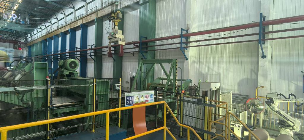 走进冷轧厂彩涂分厂,眼前的景象令人震撼。高大的机器轰鸣运转,运输车自主配送染料,整个车间几乎看不到操作工人。仅有一个集控中心和零星的维保人员,却支撑起整条生产线的高效运行。