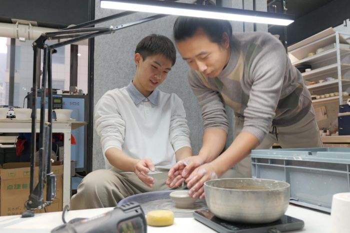 随后,团队专程走访镇安陶瓷非遗传承人黄冲,与传承人面对面交流。队员们围在黄冲师傅身边,好奇地询问着镇安陶瓷技艺的制作技巧。从选土、揉泥、拉坯,到修坯、施釉、烧制,每一道工序背后的门道,黄冲师傅都耐心讲解。他还坦言了传承过程中的困境,比如年轻传承人断层、传统技艺创新难等问题,也分享了自己在融合现代审美、开发文创产品方面的创新尝试。随后社会实践团队成员获得了亲手体验陶艺制作的机会。大家撸起袖子,跟着师傅的指导,将湿润的泥土放在拉坯机上,小心翼翼地揉捏、塑形。看着手中的泥土在旋转中逐渐成型,队员们脸上都洋溢着满满的成就感。