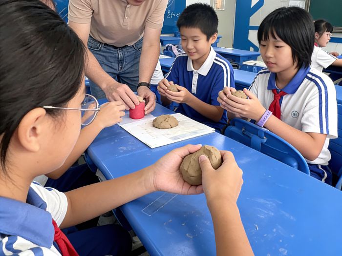 动手环节,教室里瞬间变成小小“糖艺工坊”。揉、搓、压、捏……孩子们在助教老师的指导下,专注地摆弄着手中的黏土。四年级的小杰举着自己做的孙悟空兴奋地说:“我做的孙悟空会七十二变,我要像他一样勇敢!”六年级的小彤则在作品中融入了校徽元素:“我想用糖艺做出我们学校的标志,让更多人看到林园小学。”