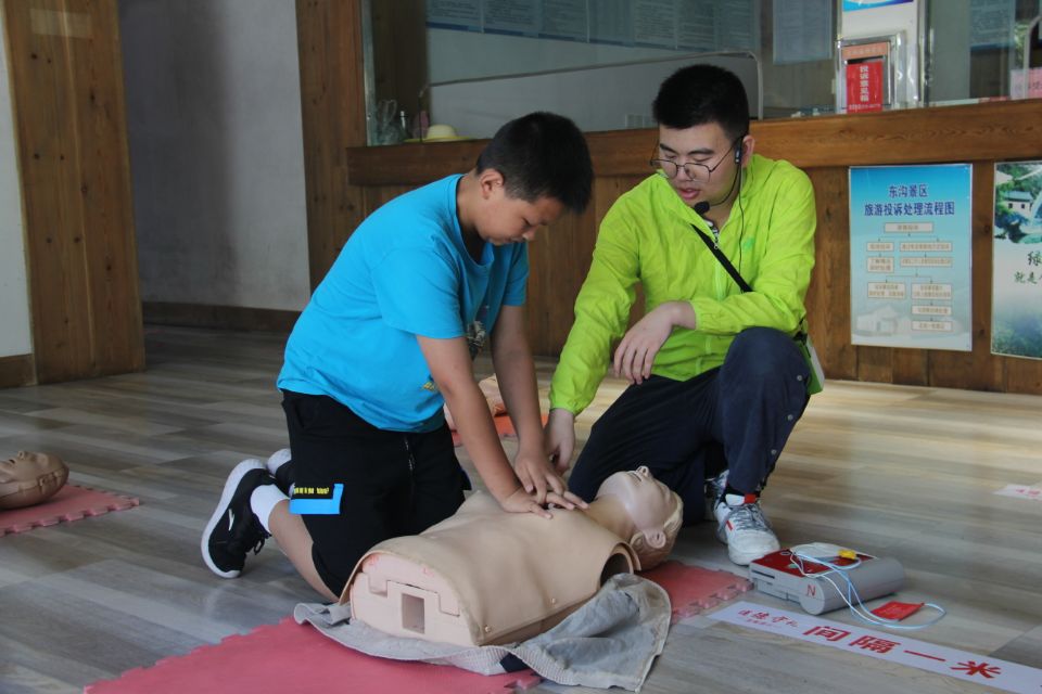 图为实践队的队员在宣讲完之后也会让村民上来实践学习,这个小朋友最后规范的做完了胸外按压,赢得了大家的掌声。