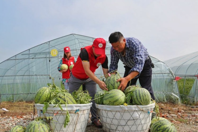 图为实践队员在瓜棚帮助瓜农一起采摘西瓜 大学校园网通讯员 梁悦悦 供图