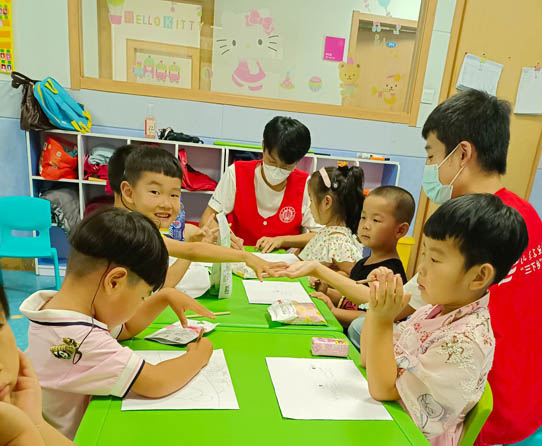 不一会儿孩子们开始上课,康复中心采取大班小班分别授课,志愿者也分成两队陪伴孩子们上课,小班的孩子们学习跳舞,大班的孩子们画画。孩子们蹦蹦跳跳,志愿者们参与进来,和孩子们打成一片,笑声充溢着整个小班教室。大班孩子拿起画笔开始画画,志愿者和孩子们一起发挥想象力,圆圆圈圈是他们心中的美好世界,墙上贴着孩子们庆祝冬奥会的作品,可爱的冰墩墩和雪容融成为孩子们的喜欢的对象,教室气氛和谐融洽。