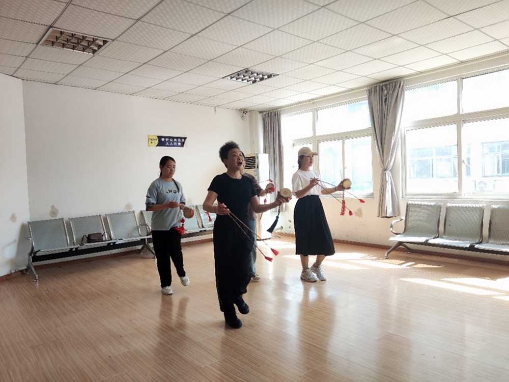 图为实践队员们学习凤阳花鼓的一些基本动作要领