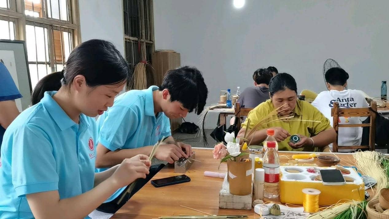 图为团队成员向竹编师傅学习编织香囊。 通讯员 欧阳志诚 供图