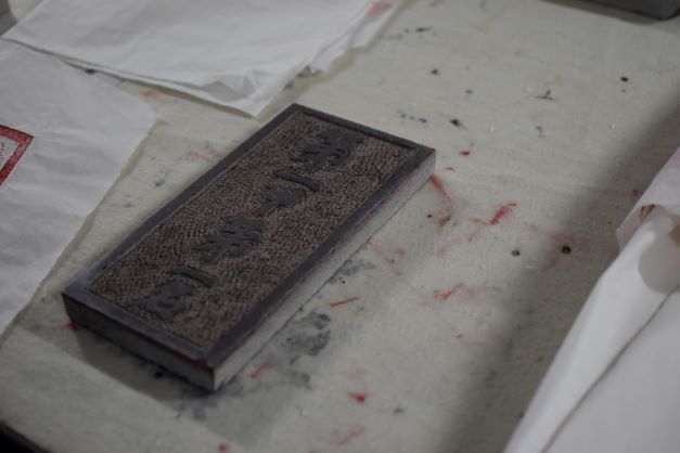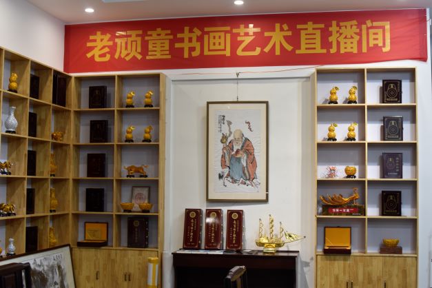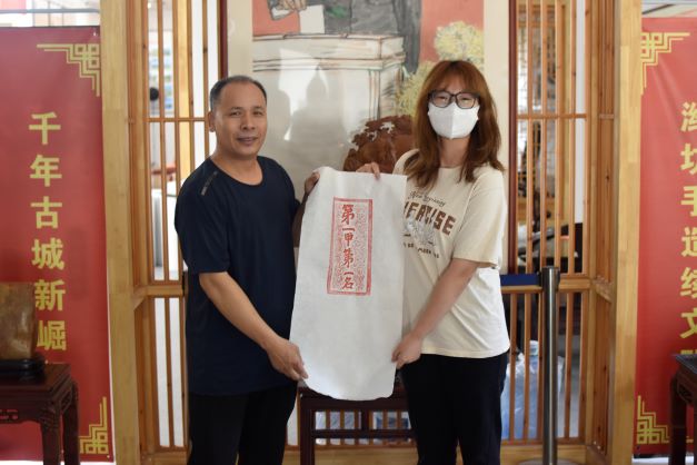 除了党史教育外,韩克诚先生还将青州非遗铝艺、拓片搬进了展厅,在学习党史之余还能寓学于乐,开拓视野,提高自身素养。韩馆长将青州特色文化刻于拓片上,并用印泥印于宣纸上。远看拓片像石碑,近看拓片像印章。我对拓片爱不释手,馆长见此便送了我一张“第一甲第一名”的作品,借此祝我学业蒸蒸日上。我十分感激韩馆长的祝福,在心中想不要辜负馆长的嘱托和期许。韩馆长表示,待疫情过后,他会将花毽和铝艺的匠人请至馆中进行非遗的制作和讲解。馆长曾是一线教育工作人员,我很敬佩他自已投资创办了集党史教育和研学为一体的红色经典艺术馆。为了更好地宣传非遗文明和技艺,馆长还通过直播平台宣传青州非遗文化。