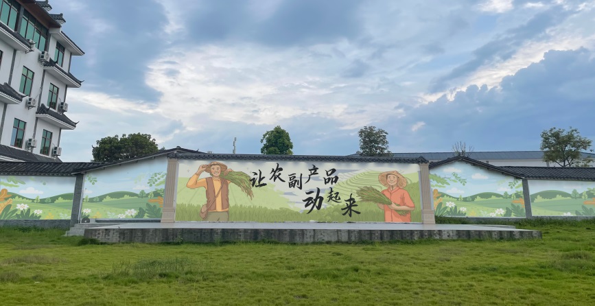 此外,团队还结合农耕文化和当地农耕特色,对博览园的部分白墙进行墙绘创作,例如在交易广场的墙面上确定“让农副产品动起来”主题的绘画。使用简单的色调,使得整体风格朴素,图像明确直观,以稻田、油菜花和丘陵的元素体现当地农耕和地形特色,图中的农民们经过一季辛勤的劳作,终于迎来了属于他们的丰收季节。看到庄稼生长茁壮、果实累累,他们充满了自豪和喜悦。整个墙绘展现了乡村生活的恬静和农民丰收的喜悦,表达了希望促进农副产品交易,增加乡村经济收入的目的。
