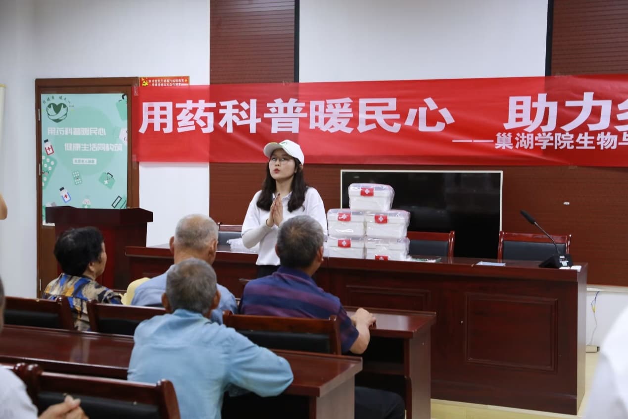 首先团队成员乘车来到了巢湖市战前村社区服务中心,在那里,我们与战前村的老人进行了深入的交流。通过问答和交流的方式,我们了解到了老年群体的身体健康状况和用药情况,并且发现了老年群体的一些用药安全隐患。在我们进行宣讲后,帮助了老年群体意识到用药安全的重要性,提高了他们的重视性,也帮助他们纠正了错误的用药认知。