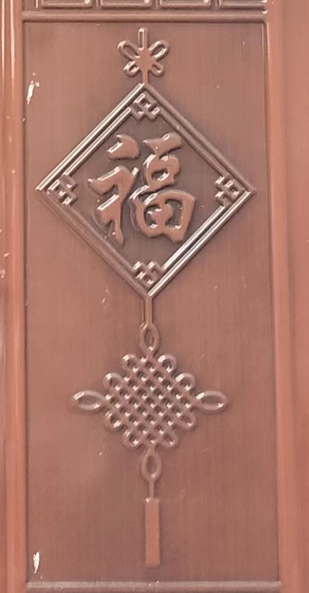 尤为吸睛的是,门扇上的两个“福”嵌在中国结中,实践队员对此很感兴趣,并向老先生问其中的寓意。老先生答道:“中国结代表着团结幸福平安,颇受咱们平民老百姓的喜爱,而且中国结符合中国传统装饰的习俗和审美观念,所以经我们一家人商定,选此门作为我们家的大门。”