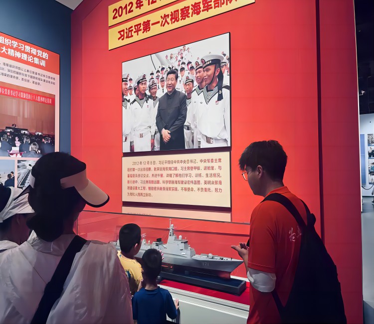 图为“红色文化需传承凝心聚魂心脉传”团队成员观看中国海军的“成长”历程。中国青年网通讯员 陈维洋 摄