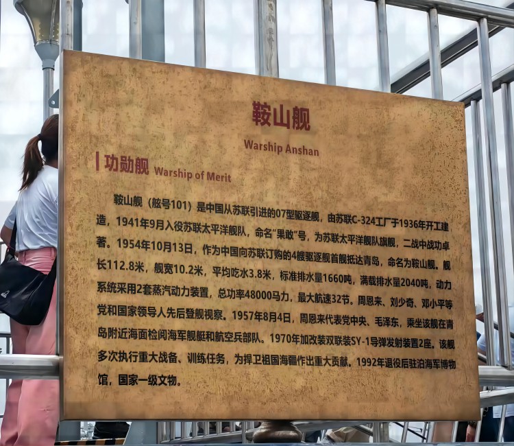 图为“红色文化需传承凝心聚魂心脉传”团队成员参观鞍山舰简介。中国青年网通讯员 陈维洋 摄
