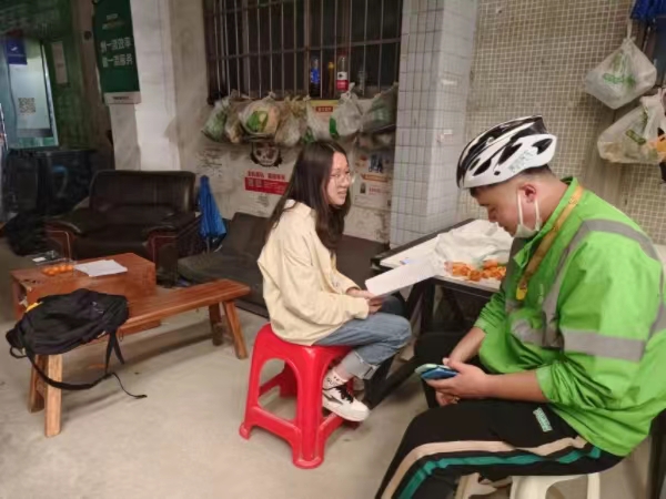 在调研的过程中,有位美团骑手小哥打着趣说,要跳槽另一个外卖平台。手机铃声叮叮当当响起,他不断唤醒手机屏幕,不断刷新页面,却没有一单是派给他的。他每天穿梭在车流如织的街道上,长时间的骑行使他身心俱疲。这样辛苦的工作不仅需要一个健壮的身体来支撑,更需要源源不断的耐力,更需要心理上的坚持与毅力。他们汗流浃背、疲惫不堪地为了送达每一份外卖而不断努力的这种专注和奉献让我敬佩不已。而在这样的辛勤付出之下,低收入却是他们普遍面临的问题之一,他们经常需要超负荷地工作,但收入却不能与付出相匹配,这让他们感到失落和无奈。