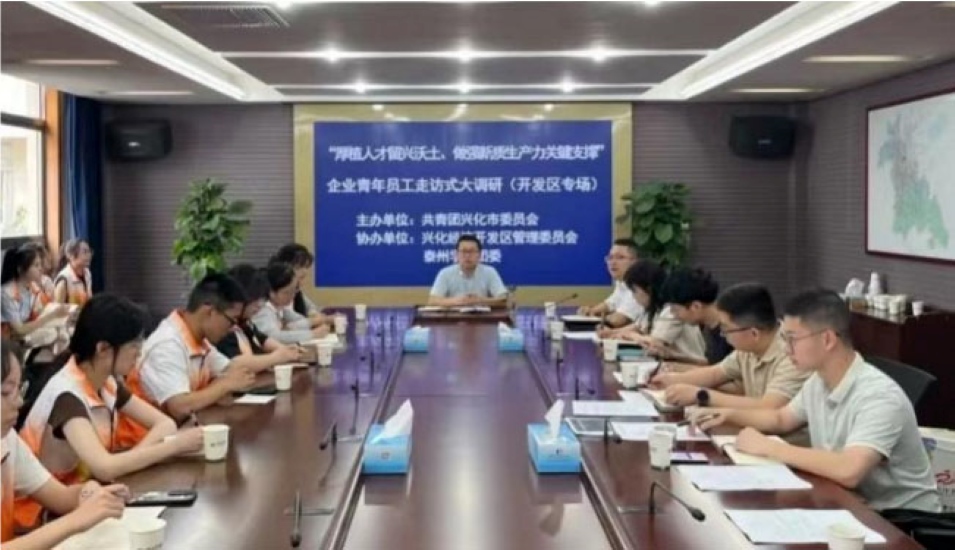 功以才成,业由才广。人才是创新和发展的根基和核心要素,为深入贯彻落实省委十四届六次全会精神,落实党中央人才工作会议部署,加快打造发展新质生产力重要阵地,助力泰州兴化市青年人才队伍建设。六月下旬,兴化经济开发区管理委员会与泰州学院经济与管理学院展开以“厚植人才留兴沃土,做强新质生产力关键支撑”为主题的聆听“青”声,凝聚“青”力企业青年员工走访式大调研(开发区专场)。