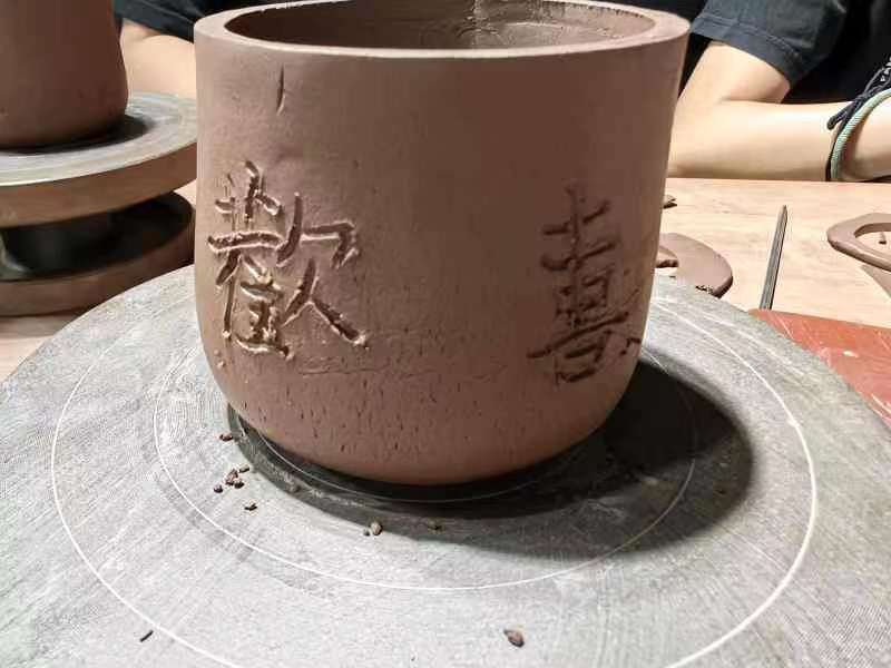 紫砂壶的装饰艺术主要体现在壶的表面。根据其不同的质地,可分为光器、花器和筋纹器。光器一般采用浮雕、线刻、拉胚等手法制成各种纹饰图案;花器和筋纹器一般采用刻、划、印等手法制成各种花卉图案;筋纹器则是以平贴、压印等手法制成各种几何图形。这些装饰手法不仅丰富了紫砂壶的造型和装饰艺术,而且提高了紫砂壶的观赏性。我根据我的喜好和愿景,在茶杯身上写下“喜乐”二字,我希望我们一直能平安喜乐。