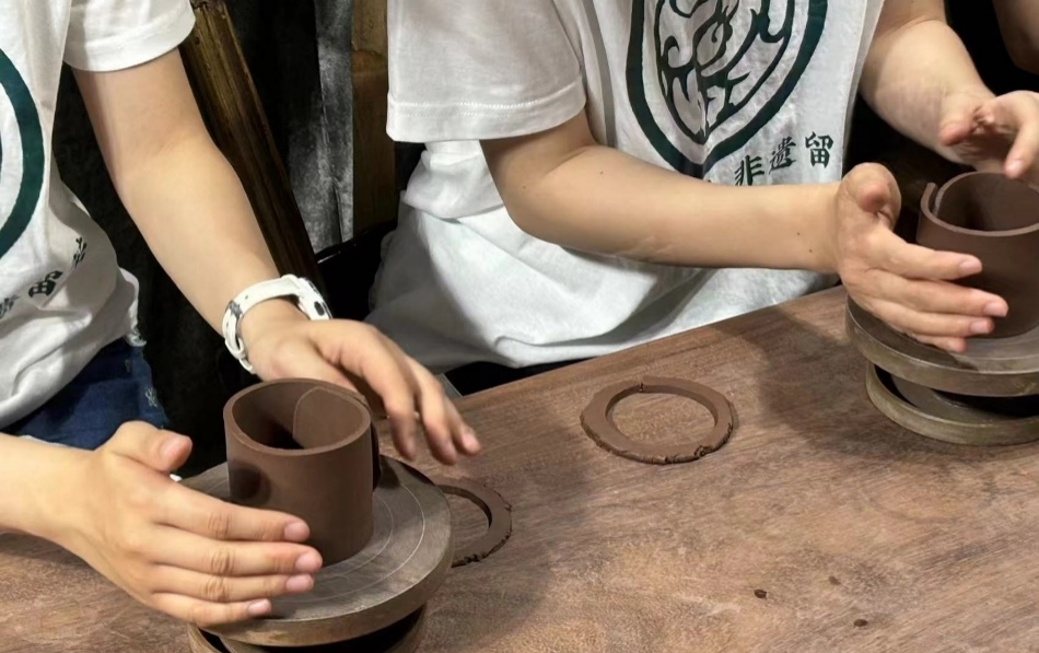 图为团队成员体验紫砂陶制作。中国青年网通讯员 张禾 供图