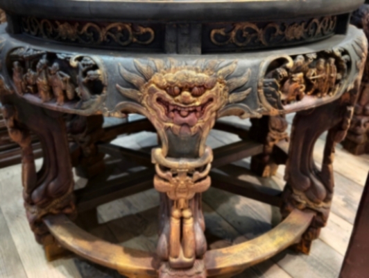 其中通山木雕技法下的木狮圆桌让实践队尤为惊叹,其整体为四根微拱圆弧的柱子支撑起一块圆形木桌,圆桌整体分为两层且两层相隔的中间均雕刻着缠绕的花纹,其中每根柱子与圆桌相接的地方雕刻着一只栩栩如生、威严高贵的狮头,尤其是狮头的眼睛及其传神,虽然雕刻技法看似浅显却引得实践队频频回目认真观摩,展开一次来自精神的共鸣,穿越历史的交流。狮头相间的中间各自雕刻者不同的四幅神态各异、人物各异的浮雕,不得不让实践队感慨雕刻者经验之丰富,技法之成熟,这也让实践队成员更加坚定要学好并传承好悠久神秘的木雕技巧,让其流芳百世,传承千古。