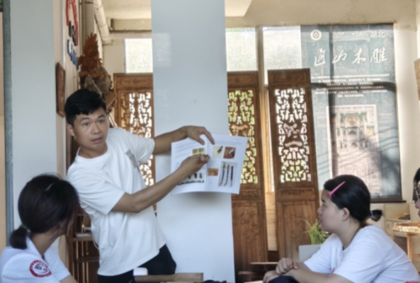 图为传承者成希老师为实践队讲授通山木雕悠久历史。通讯员 谭子露 摄