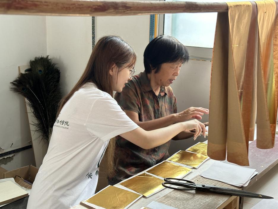 最后,我们随熊师傅体验了金箔锻制中的揹金环节。刷纸、搭金、接金……每一项工序都不能马虎,都有严格的要求。炎热的夏季,小小的房间里没有空调、没有风扇,还要静心专注于揹金。师傅们就在这种环境下认真工作,做出熠熠生辉的金箔与金线,体现着匠人的勤劳、专业、严谨。
