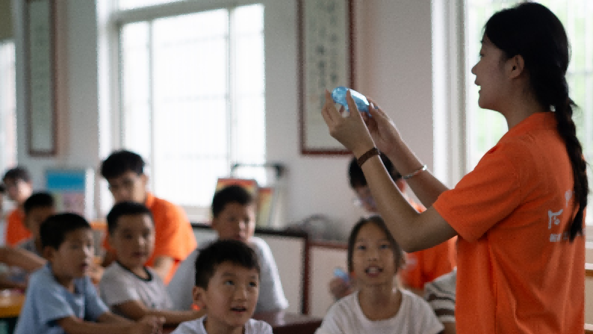 图为繁星筑梦暑期社会实践团队成员向小朋友们教授知识。 陈德超摄