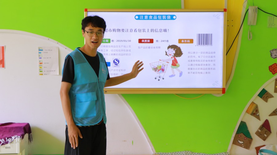 图为服务队志愿者在为世纪金园大学城幼儿园小朋友们介绍食品安全宣讲PPT的目录。杨福森摄