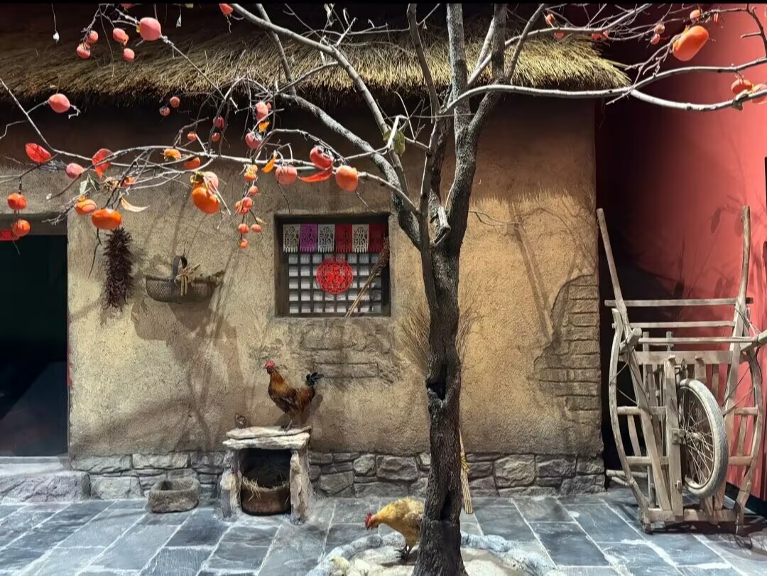 而在博物馆的另一处角落,展现的是一幅充满生活气息的庭院场景,一棵光秃秃的树枝上挂满了红彤彤的柿子和一串串红辣椒,这独特的装饰方式让人眼前一亮。柿子寓意着“事事如意”,红辣椒象征着红红火火,两者结合,表达了人们对生活的美好期盼。树下,几只栩栩如生的鸡正在觅食,旁边的石磨和手推车仿佛在诉说着过去人们辛勤劳作的故事。墙上的窗花和福字与屋内场景相呼应,而那辆老旧的手推车则让人联想到过去人们在春节前忙碌地准备年货,走亲访友的热闹场景。这些看似平凡的物品和场景,却蕴含着深厚的春节民俗文化,它们是历史的见证,是传统文化的传承。