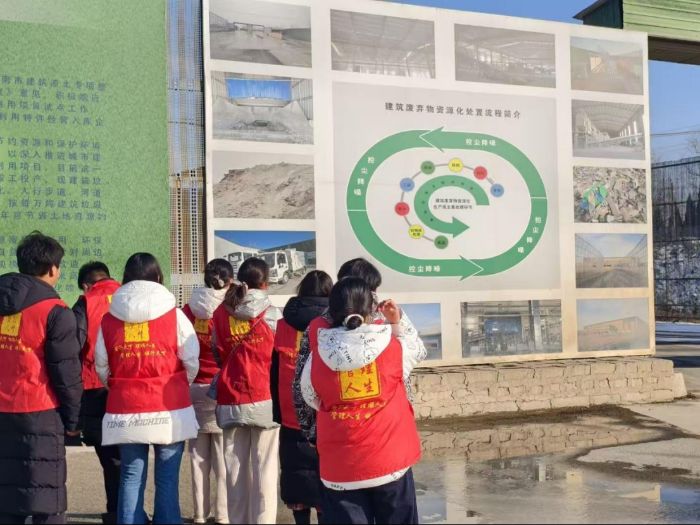 在美丽中国建设纵深发展、国家固废治理行动全面实施的时代背景下,建筑废弃物资源化成为破解“垃圾围城”、践行“绿水青山就是金山银山”理念的可行路径之一。然而,这一兼具减污降碳与资源循环的产业,其背后却面临着多重发展桎梏。为探寻建筑废弃物资源化行业发展的深层次梗阻问题,推动建筑废弃物资源化更好服务“固废治理行动”与“生态文明”国家战略,1月21日,山东建筑大学绿色低碳发展社会实践团队在指导老师苏杨月,王宁的带领下赴济南市历城区山水宏鑫建材厂开展实地调研。
