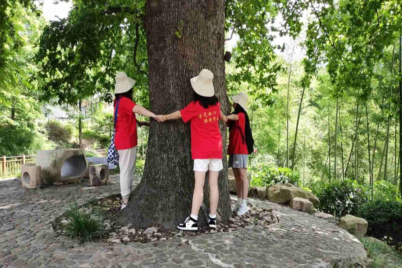 图为四名实践队员感悟百年老树——“神枫”。大学生新闻通讯员 陈文杰 摄